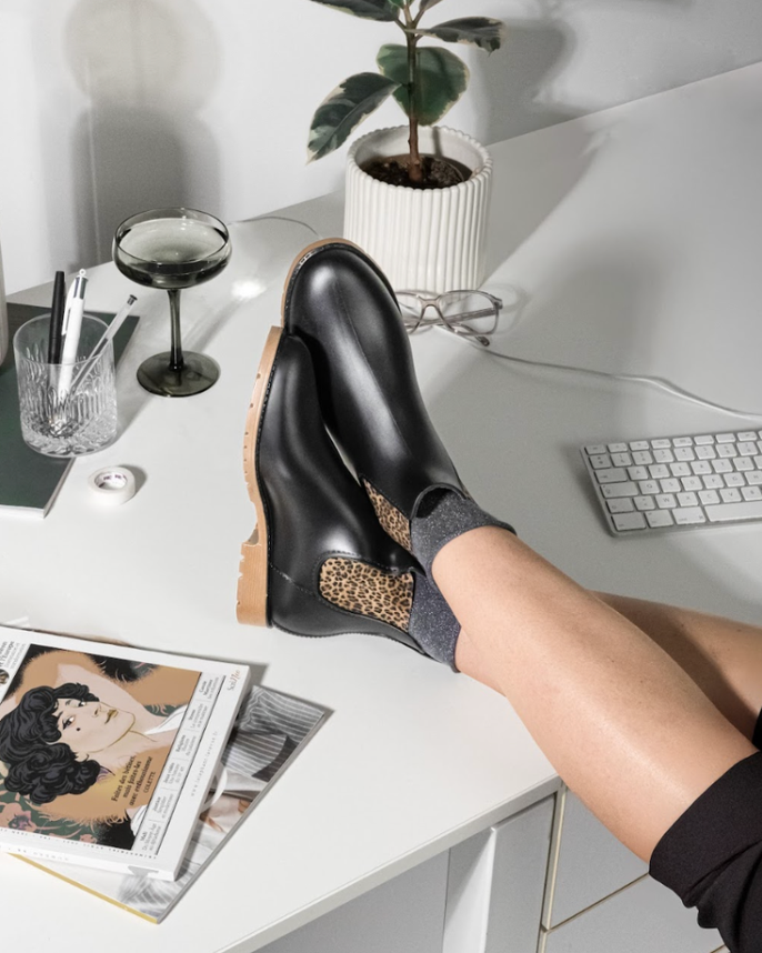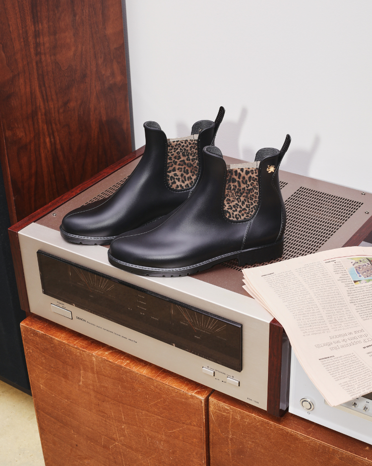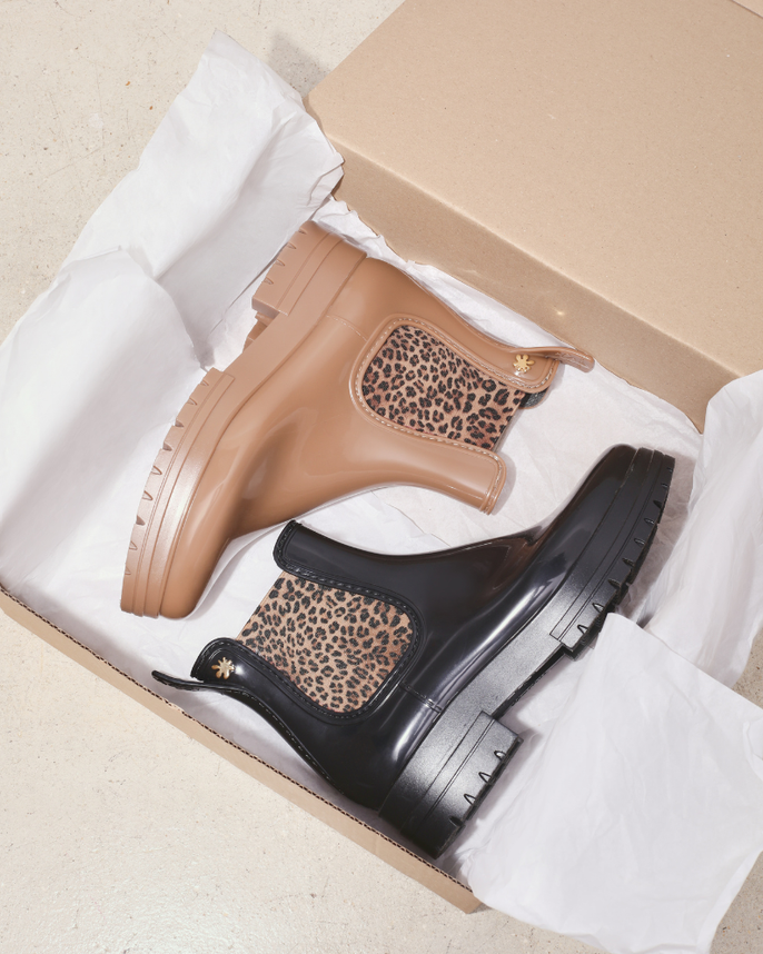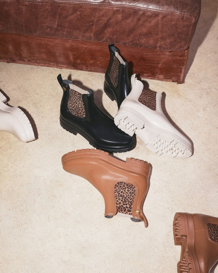 Découvrez LA bottine femme incontournable de la saison. Ce modèle noir à semelle fine se distingue par ses empiècements élastiques à imprimé léopard, qui transforment un essentiel des jours de pluie en véritable pièce mode. Un détail discret mais affirmé, qui signe votre style même sous les nuages.