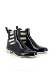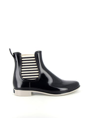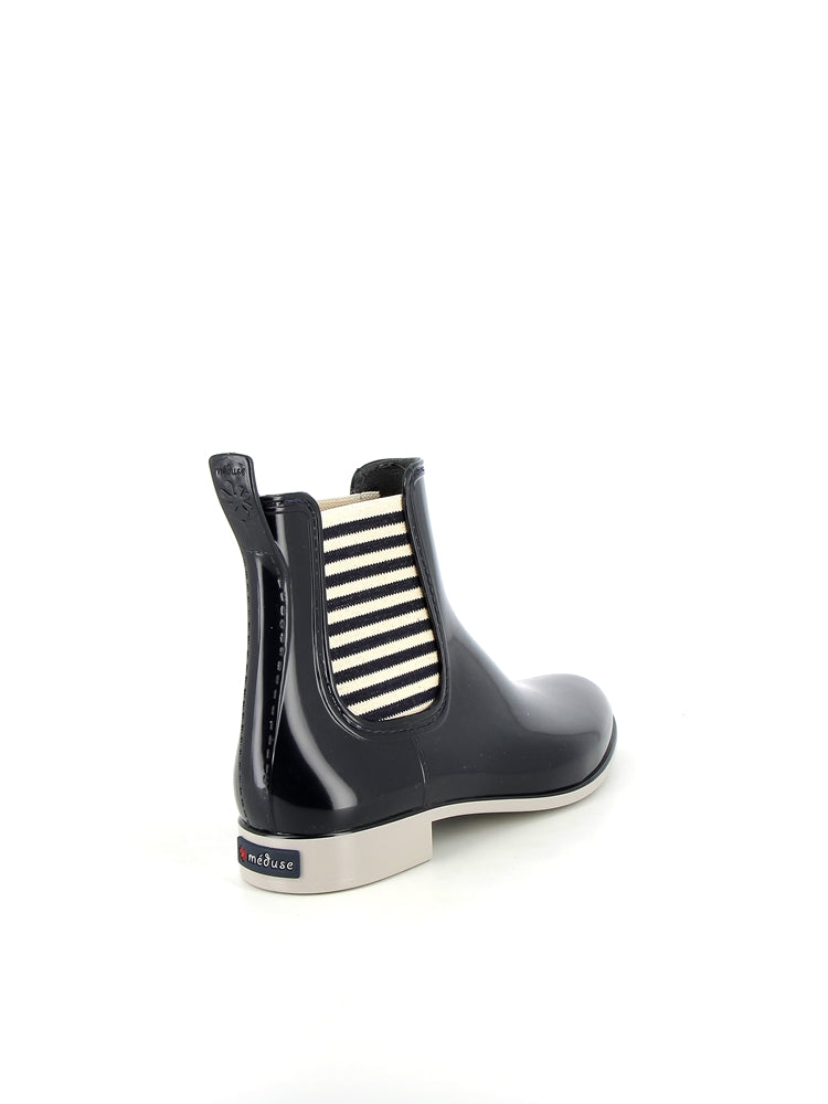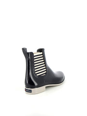 La teinte marine intemporelle de ces bottines pour femme évoque l'horizon infini de la mer, offrant une sobriété élégante. L'élastique marinière, emprunté à l'univers nautique, ajoute une touche de caractère et de tradition au design. Cette combinaison crée des bottines à la fois classiques et contemporaines, parfaites pour affronter les averses avec style.