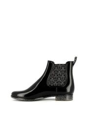 L'engagement envers l'excellence se manifeste dans chaque détail de ces bottines de pluie vegan. Fabriquées en France avec des matériaux de première qualité, elles offrent une résistance à l'eau pour garder vos pieds au sec, tandis que la semelle argent pailletée ajoute une touche de glamour à chaque pas.