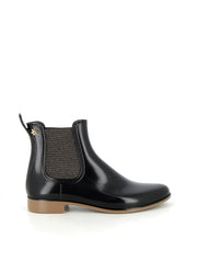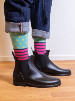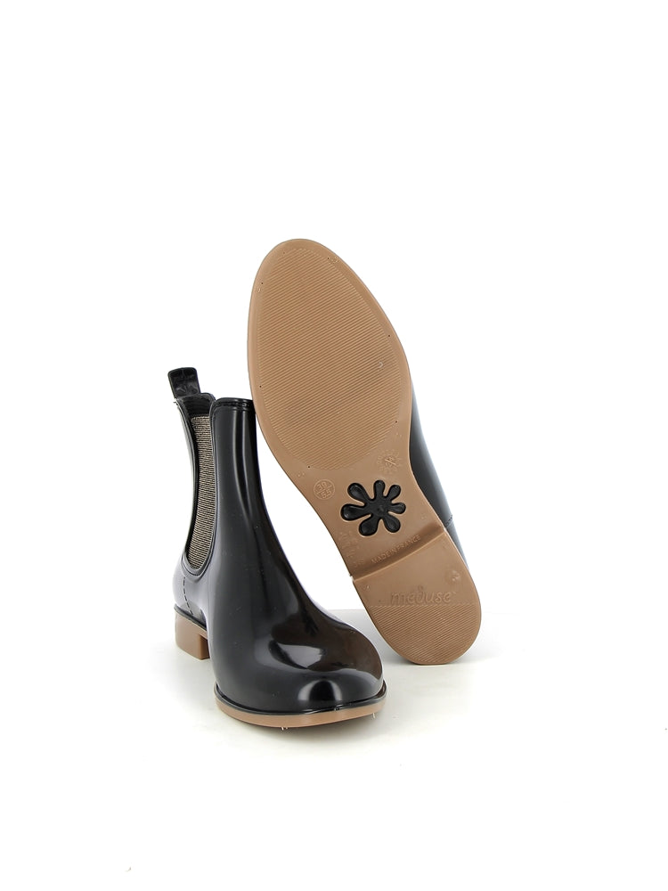 Découvrez nos nouvelles bottines de pluie pour femme Méduse. Semelle plate, finition brillante et élastique doré pailleté, ne serait-ce pas là la recette d'une paire à tomber ? Faciles à enfiler et très confortables, elles sont fabriquées en France avec amour.