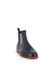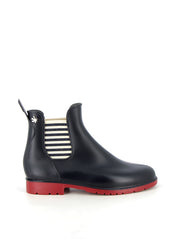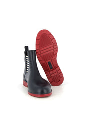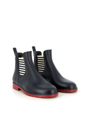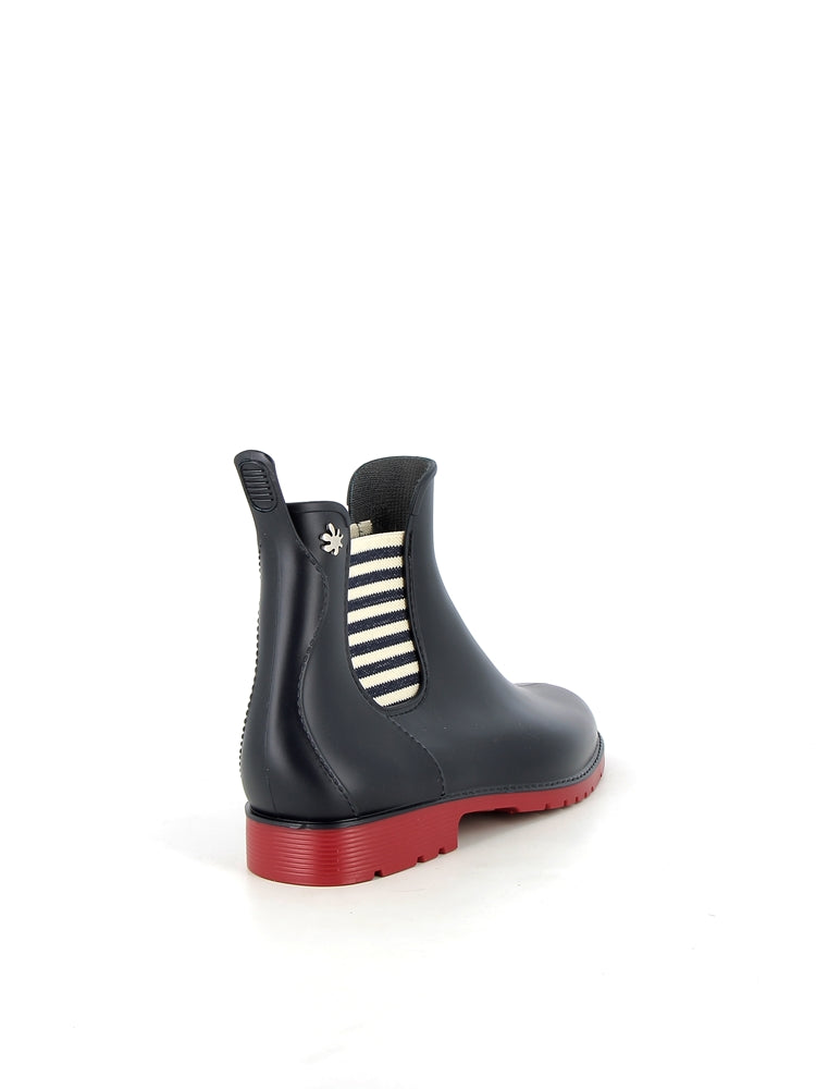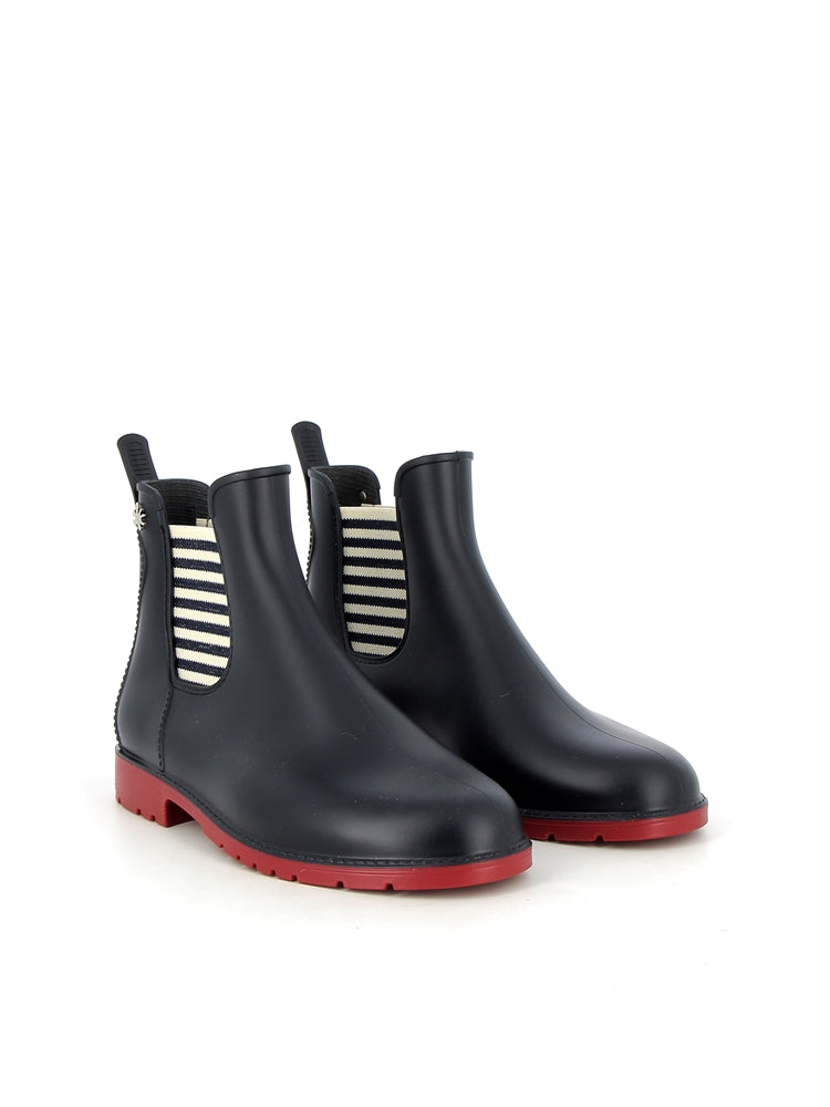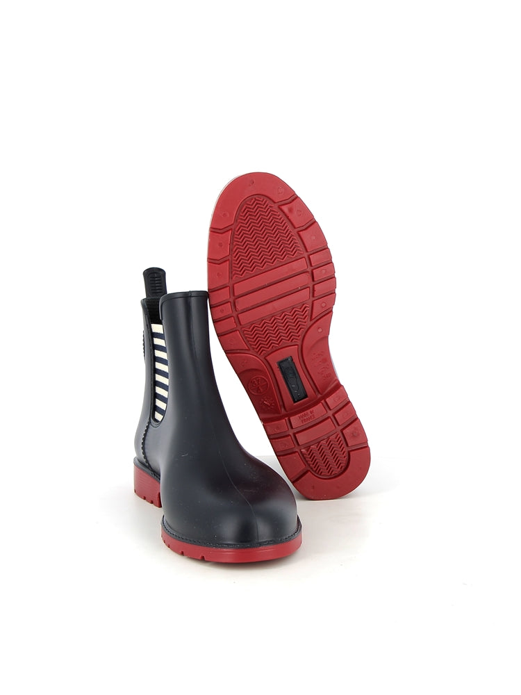 Pluie ou soleil, affichez votre style avec la bottine pour femme en PVC ! Sa teinte marine chic, twistée par une semelle rouge foncé et un élastique rayé ultra-tendance, fait toute la différence.