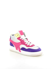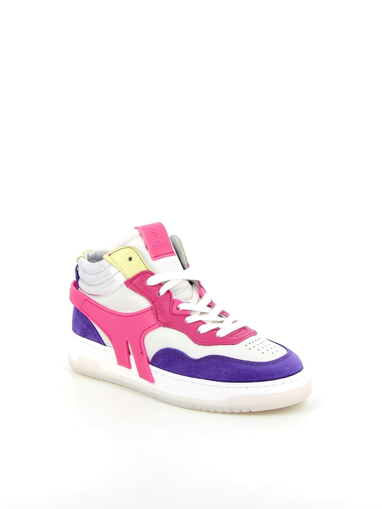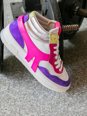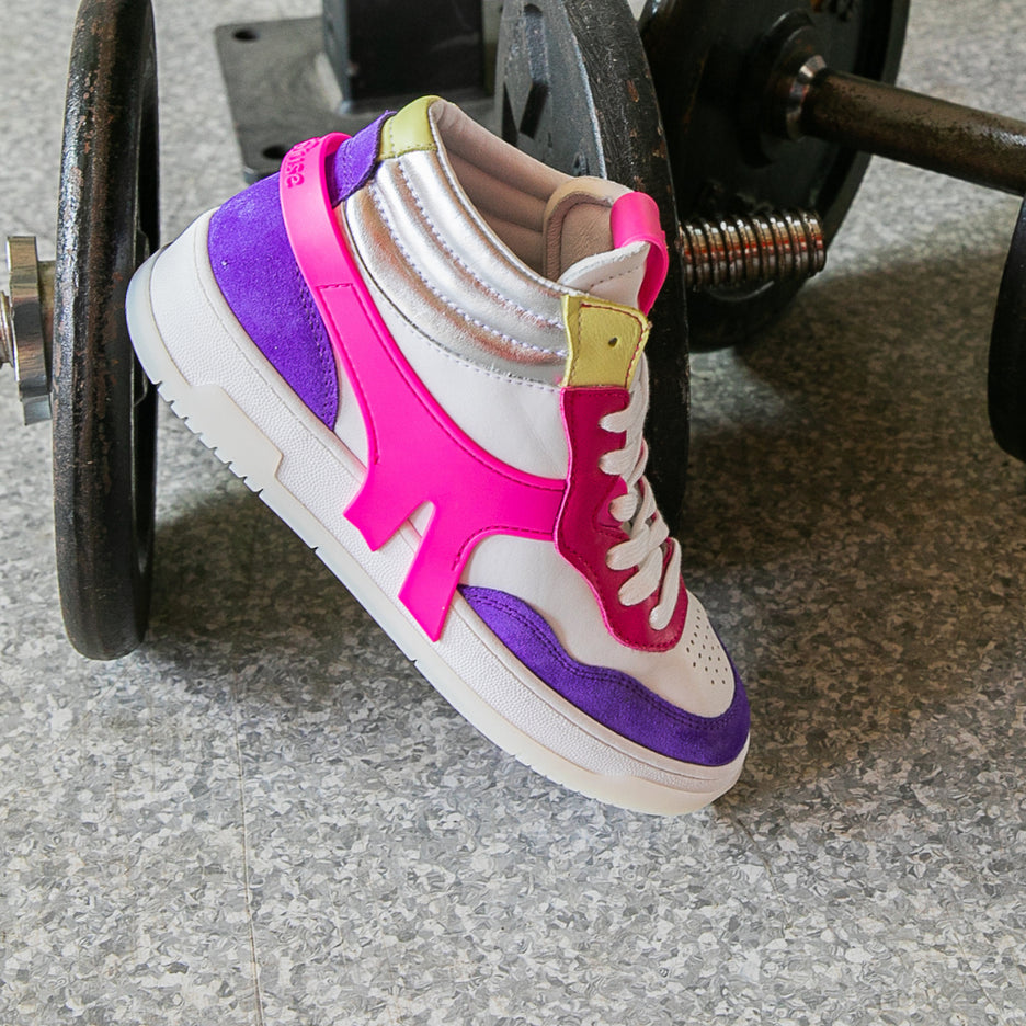 Nos baskets montantes femme en cuir premium allient une silhouette élégante à une touche de fantaisie grâce à leur applique latérale en PVC aux coloris vibrants de violet, fuchsia et argenté. Chaque paire raconte une histoire de style urbain et de sophistication, offrant à celle qui les porte une sensation de confiance et de liberté qui accompagne chaque pas.