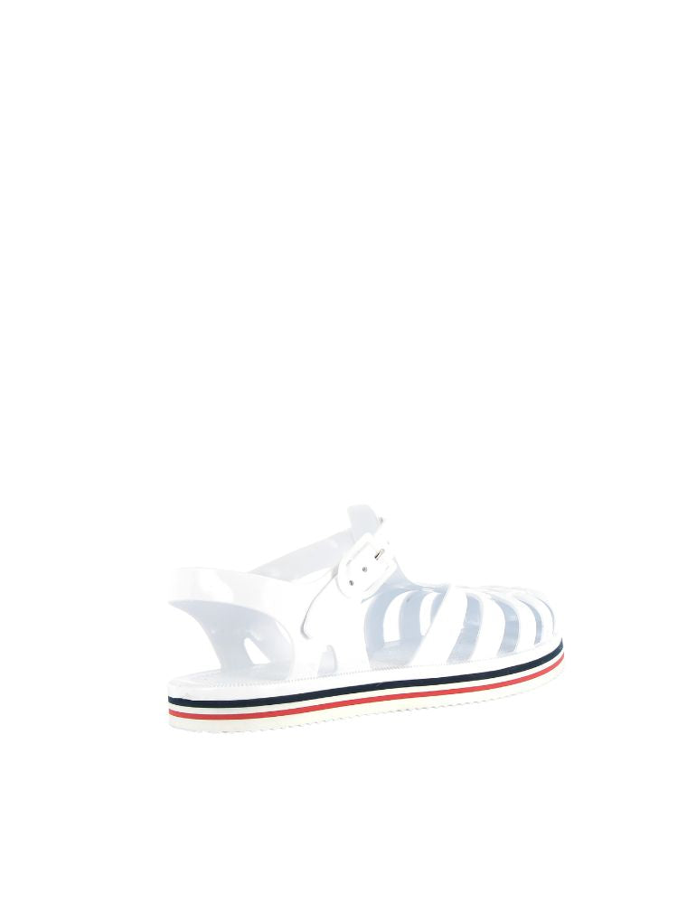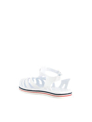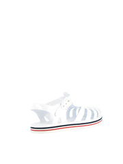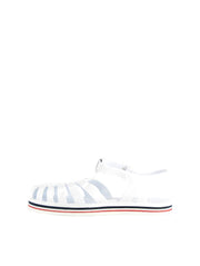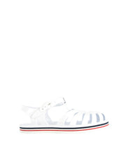 La sandale Méduse Vegan en blanc se distingue par son design épuré rehaussé de lignes colorées bleu, blanc et rouge, ajoutant une touche de dynamisme à votre look urbain. Son esthétique élégante et ses détails subtils en font un choix parfait pour compléter n'importe quelle tenue, que ce soit pour une journée de travail ou une soirée entre amis.
