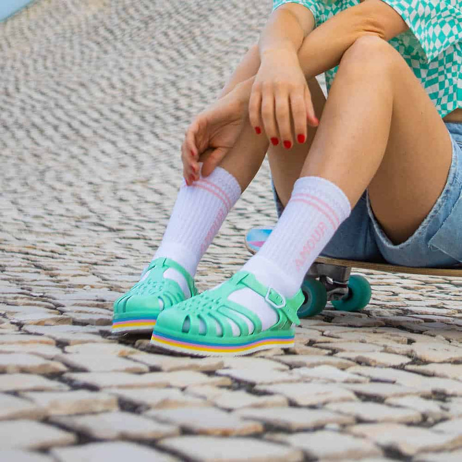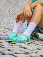 La sandale Méduse en vert clair se démarque par son design épuré sublimé par des touches de couleurs vives. Les lignes colorées bleu, rose et jaune sur la semelle EVA blanche apportent une touche de dynamisme à votre tenue urbaine. Son esthétique sophistiquée en fait un choix parfait pour compléter votre look, que ce soit pour une journée de travail ou une sortie entre amis.