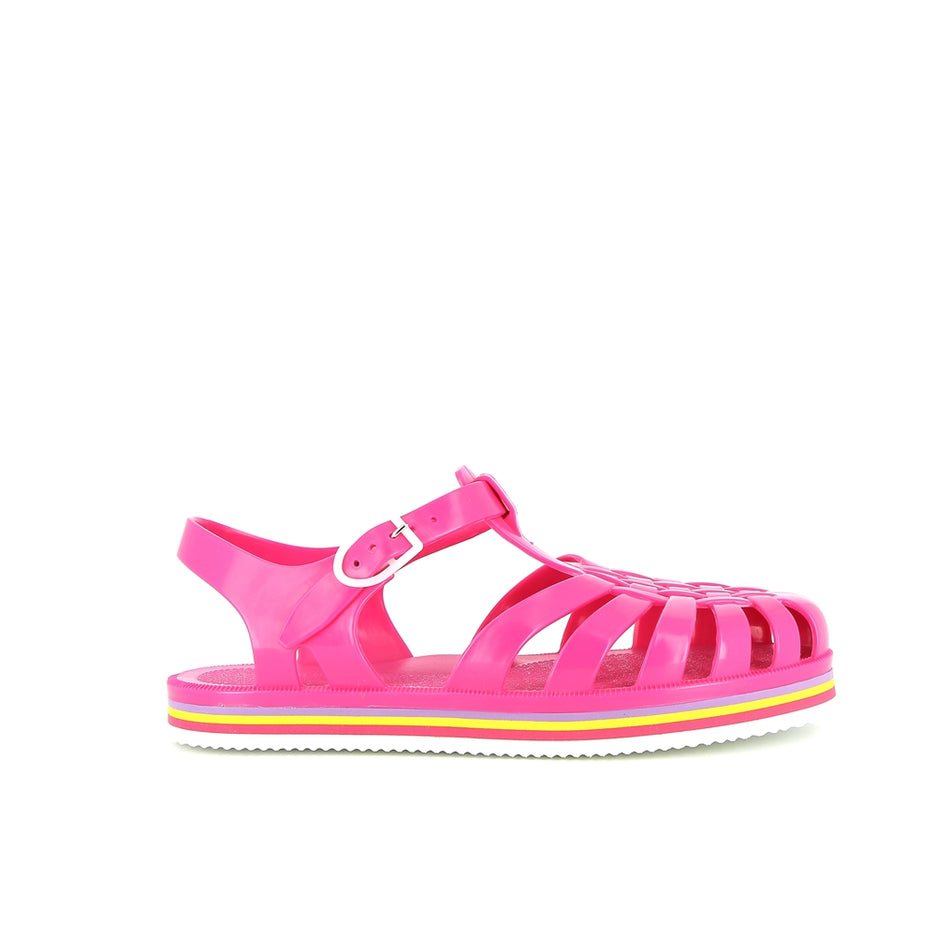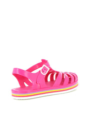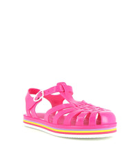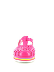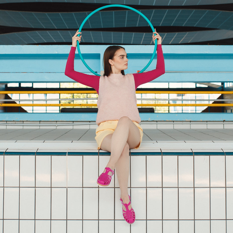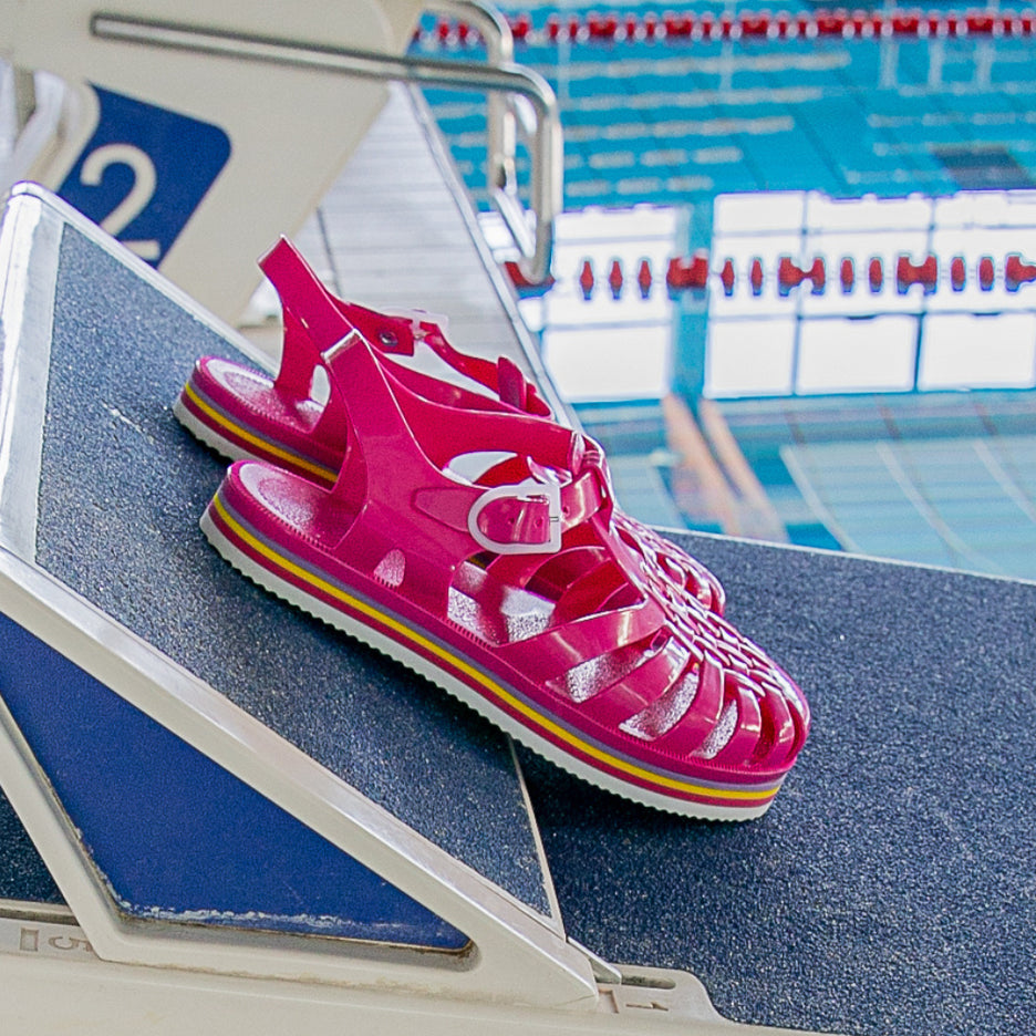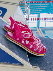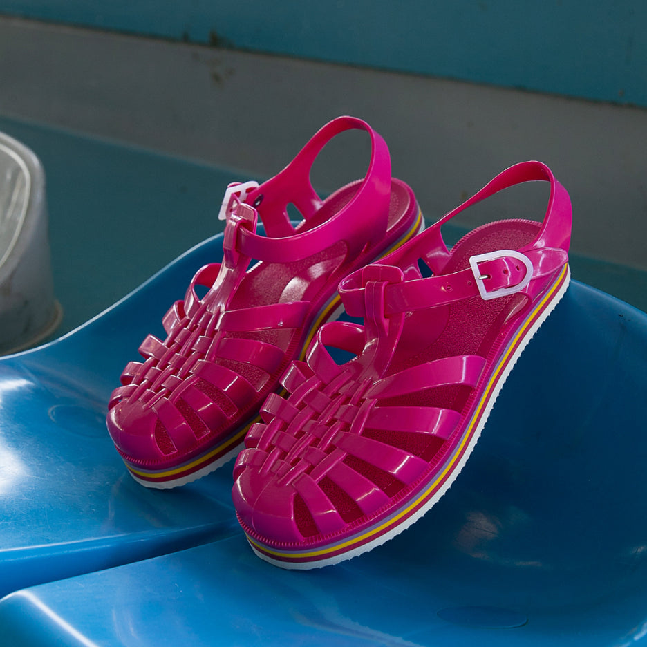 La sandale Méduse est de retour avec une nouvelle silhouette audacieuse et une teinte vibrante de fuchsia, idéale pour égayer vos escapades urbaines. Fabriquée en PVC français garanti sans phtalates et vegan, cette sandale incarne le mariage parfait entre style et qualité. Montée à la main avec une semelle EVA blanche ornée de lignes colorées, elle offre un confort exceptionnel et une esthétique urbaine chic.